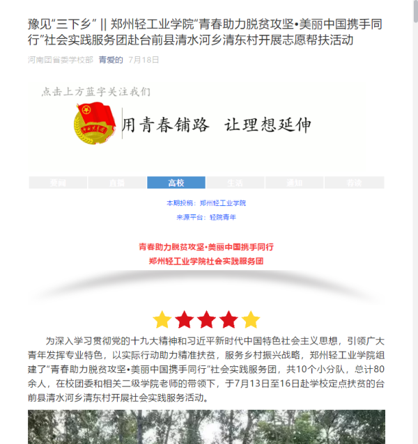 该服务队已被河南团省委平博(中国)部微信公众号、微视台前公众号所报道:(豫见“三下乡” || 郑州轻工业学院“青春助力脱贫攻坚•美丽中国携手同行”社会实践服务团赴台前县清水河乡清东村开展志愿帮扶活动:https://mp.weixin.qq.com/s/59z3zoba66bxTcVerrpbJg