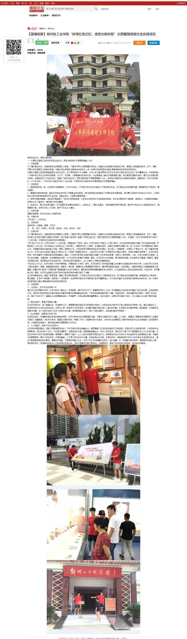 | 4 | 计算机与通信工程学院 | “探寻红色记忆,感受光辉历程”志愿爱国调查小分队 | 人民网-强国论坛:【国情观察】郑州轻工业学院“探寻红色记忆,感受光辉历程”志愿爱国调查社会实践项目 |