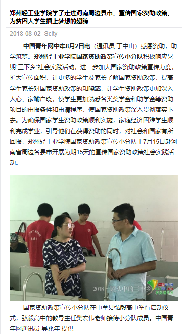 该服务队已被中国青年网所报道:(郑州轻工业学院学子走进河南周边县市,宣传国家资助政策,为贫困大学生插上梦想的翅膀: