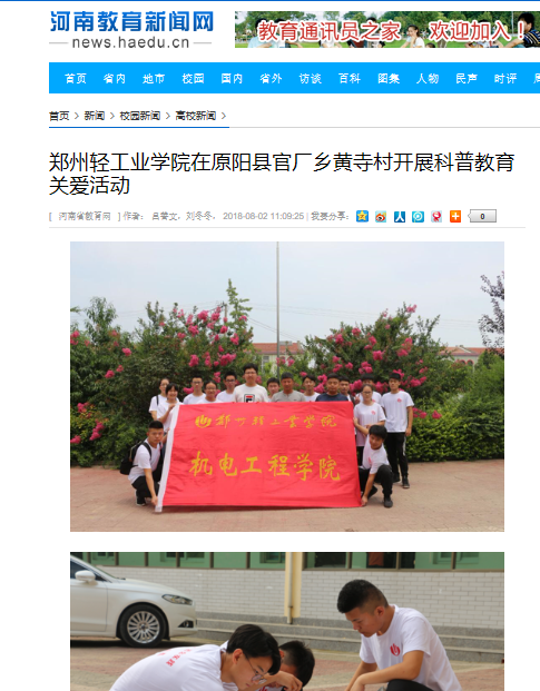 | 2.河南教育新闻网:郑州轻工业学院在原阳县官厂乡黄寺村开展科普教育关爱活动 | |||
