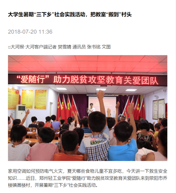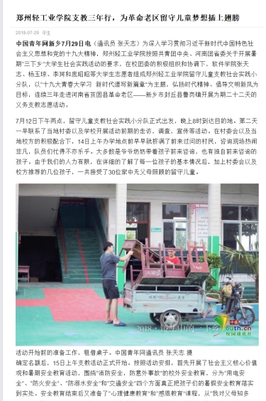 该服务队已被《大河网》所报道:(郑州轻工业学院启动社会工作教育扶贫大学生暑期社会实践活动: