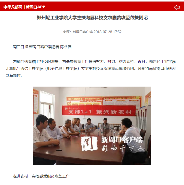 该服务队已被中华龙都网所报道:(郑州轻工业学院大学生扶沟县科技支农脱贫攻坚帮扶侧记: