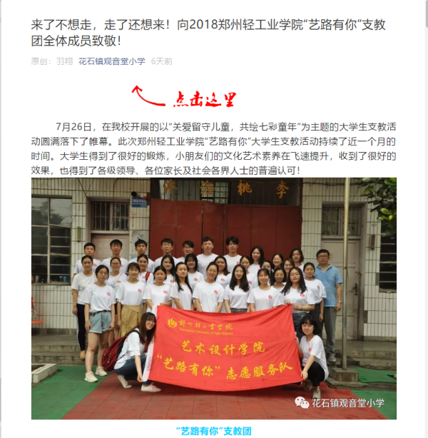 | 24 | 艺术设计学院 | “艺路有你”艺术支教小分队 | 花石镇观音小学公众号:来了不想走,走了还想来!向2018郑州轻工业学院“艺路有你”支教团全体成员致敬! |