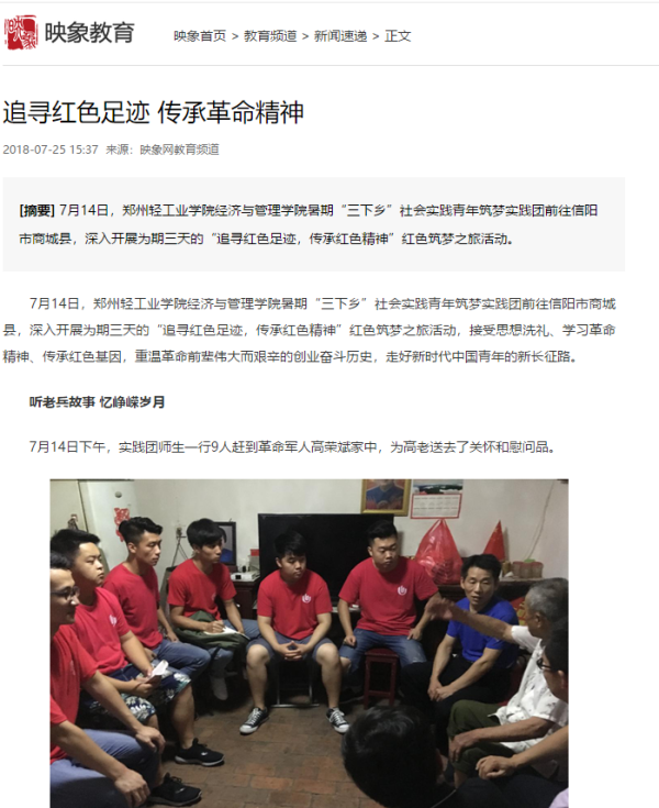 | 10 | 数学与信息科学学院 | “新时代·新梦想”产业深化改革观察团 | 新华网河南:郑州轻院产业深化改革观察团暑期走访企业 |