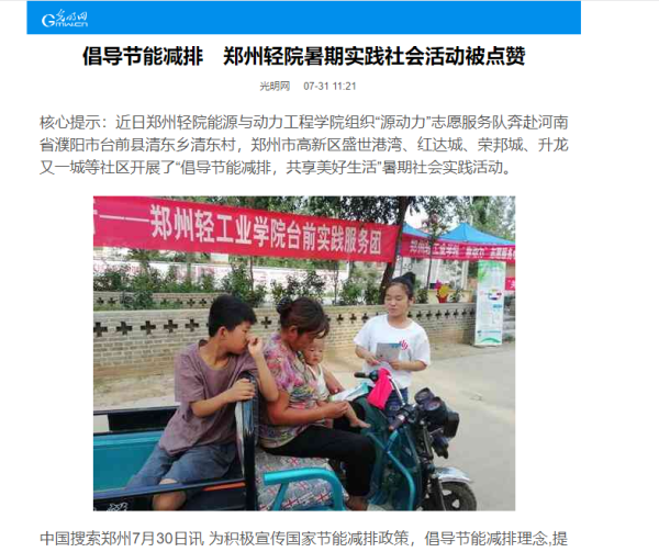 | 20 | 能源与动力工程学院 | “源动力”志愿服务队 | 大河网:郑州轻工业学院暑期实践活动倡导节能减排 获百姓点赞 |