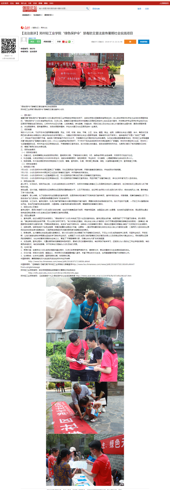 | 3.人民网-强国论坛:【法治宣讲】郑州轻工业学院“绿色保护伞”禁毒防艾普法宣传暑期社会实践项目 | |||