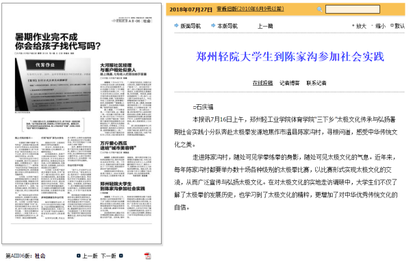 | 21 | 体育学院 | 改革开放40年“太极文化”的传承与弘扬调研队 | 大河网:郑州轻院大学生到陈家沟参加社会实践 |
