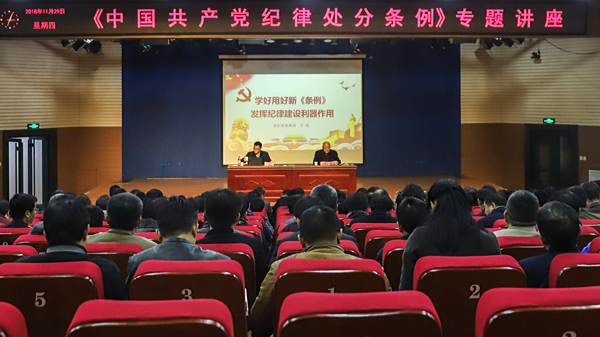 11月29日下午,我校学习贯彻新修订的《中国共产党纪律处分条例》(以下简称《条例》)专题讲座在东风校区演讲厅举行。省纪委监委正处级纪检监察员方亮同志应邀来校作题为《学好用好新<条例>,发挥纪律建设利器作用》专题辅导报告。全体在校校领导、全体中层干部、全体纪检监察干部及机关、二级学院科室负责人参加了讲座。讲座由校纪委书记张晓根主持。
