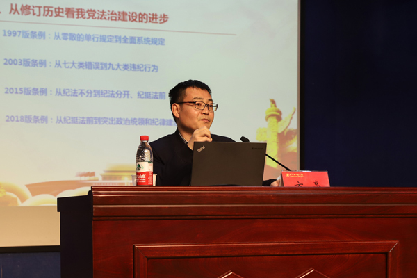 纪委书记张晓根在主持讲座中强调,全校各级党组织要牢固树立“四个意识”,担负起全面从严治党政治责任,持续抓好新《条例》的学习培训、宣传教育和贯彻执行,扎实推进全面从严治党向纵深发展。