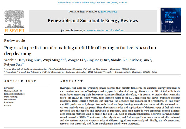 机电工程学院何文斌教授团队在工程技术领域国际顶级期刊《Renewable and Sustainable Energy Reviews》(中科院一区TOP期刊,影响因子15.9)发表题为“Progress in prediction of remaining useful life of hydrogen fuel cells based on deep learning”(深度学习在氢燃料电池剩余寿命预测中的进展)的综述性研究论文。