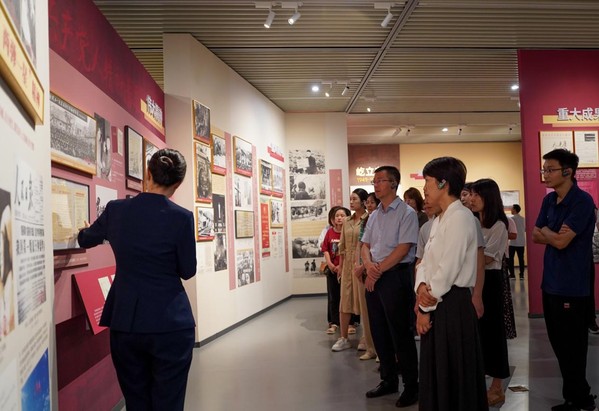 活动第一站是河南省档案馆“江河奔腾、红色浪潮”——新中国成立75周年长江黄河流域专题档案展。展览设置“序厅”“屹立东方”“改革春风”“走向复兴”“人间正道”五个篇章,精选了中央档案馆和长江黄河流域档案馆300余件(组)红色珍档。档案展系统展现了新中国成立以来,党领导人民治理黄河、推动流域发展的壮阔历程。参观过程中,大家认真聆听讲解,仔细观看每一件档案展品,深刻感受新中国的历史文化、时代变迁、奋斗历程和历史性成就。