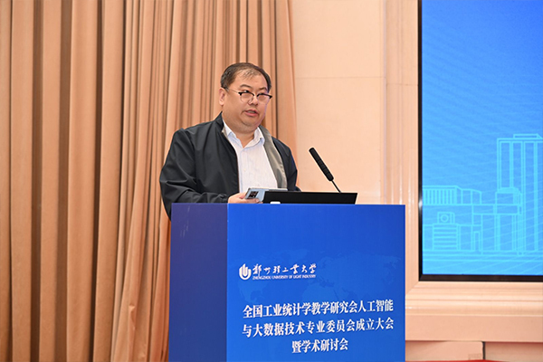 大会执行主席、全国工业统计学教学研究会副会长、全国应用统计专业学位研究生教育指导委员会委员兼案例组组长、首都经济贸易大学张宝学教授代表全国工业统计学教学研究会致辞,对人工智能与大数据技术专业委员会的成立表示祝贺。