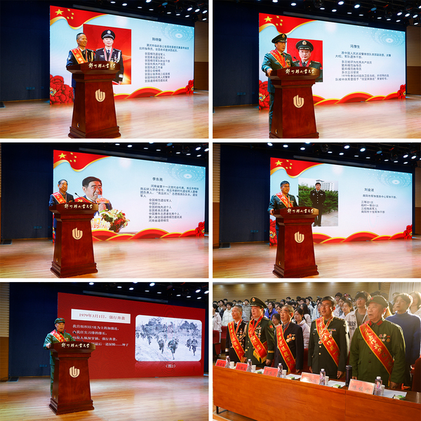 边境反击作战“攻坚英雄连”原武警部队某部副政委冯豫生、边境反击作战一等功臣刘金波、边境反击作战集体一等功成员陈铭宝、全国模范退役军人陈晓磐、全国模范退役军人李东亮分别深情讲述各自感人至深的光辉英雄事迹。他们有的在军营穿越烽火硝烟,以赫赫战功镌刻辉煌;有的脱下戎装、军魂不改,默默扎根各行各业,以实际行动践行职责与担当;有的退休后发挥余热,续写奋斗故事;他们用矢志不渝的追求、永不褪色的忠诚与担当谱写的感人故事,让现场的师生深刻感受到英雄精神的伟大力量,现场互动声和掌声持续不断,气氛庄重而热烈。